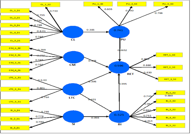Discriminant validity was found to determine the scale to which some factors are truly distinct from other factors in the model. Discriminant validity, a basic building block of model evaluation, ensures that a construct measure is empirically unique and represents phenomena of interest that other measures in a structural equation model do not capture (Hair Jr., 2010). The Fornell-Larcker criterion, cross loading criterion (Hair, 2017), and Heterotrait-Monotrait ratio of correlations (HTMT) (Henseler, 2015) were used to assess discriminant validity. The output in Table 4 represents that all defined constructs exhibited sufficient or adequate discriminant validity, where the square roots of AVEs for the reflective constructs of CL (0.763), CM (0.826), LTC (0.782), SI (0.791), PU (0.758), RET (0.879), BI (0.731) were all higher than the values of the inter-construct on the same columns and rows (Fornell & Larcker, 1981).