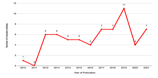 Figure 2 illustrates the incorporated article count over the review period (2010-2022). The peak was in 2019 (n = 11) was the peak, with 2020 (n = 4) witnessing a decline. The 64 included articles were published in 39 different journals. The South African Journal of Higher Education ranked first (n = 8), followed by the British Journal of Educational Technology (n = 6), and the Africa Education Review, the International Journal of Educational Technology in Higher Education, and the Journal of Education and Information Technologies (n = 3). A large number (n = 29) of single journal publications were also recorded. The full list of journals is provided in Appendix 1.