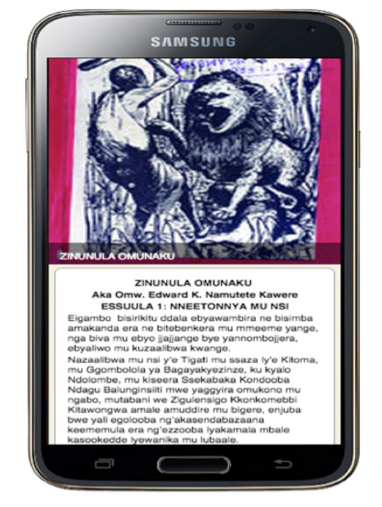 Each one of the 11 groups of teacher-trainees chose an excerpt of a chapter in a Luganda language literary text called Zinunula Omunaku. Zinunula Omunaku is one of the most widely read novels in Luganda language. “Zinunula Omunaku…” is a proverbial name in Luganda language, which is completed as “…Lugaba azitunga kiro”. This Luganda proverb is loosely translated as: “The [money]) which rescues the poor is stitched (made) by God at night”. As a pre-colonial novel, Zinunula Omunaku recounts the life of an orphaned boy who, through all sorts of trials in life, triumphs, becomes famous and marries Mirembe, one beautiful daughter of a great village chief (Kawere, 1982). After selecting different excerpts from Zinunula Omunaku, each of the eleven (11) groups of teacher-trainees was guided to use http://mo.is.it to convert its excerpt into an e-learning object for deployment on different smartphones. Figure 5 below is a sample of e-learning object that was deployed on a Samsung Galaxy SII.
