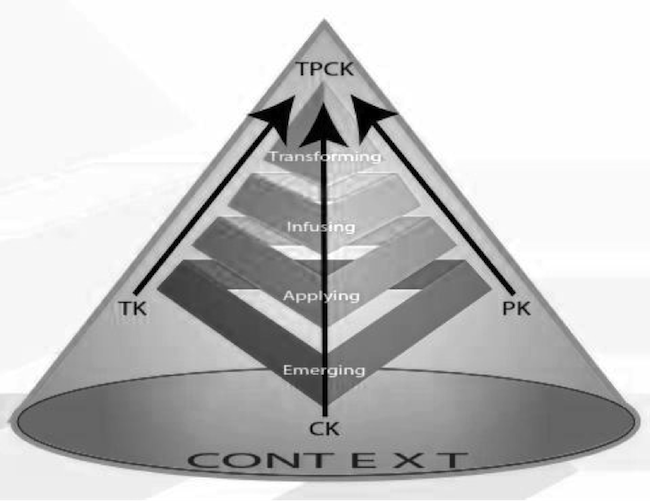 The ICTeTD model integrates the four stages of ICT integration (Fig. 2) hereby conceptualised as a three dimensional pyramid, embedded in a cone, both tapering to the apex from the base where the Emerging stage is located, (that is for the pyramid), and the circular base of the cone represents the context. The apex of the CB pyramid includes the Transforming stage and is marked at the tip by the highest competence, characterised by technological pedagogical content knowledge (TPCK), which marks the highest level of CB.