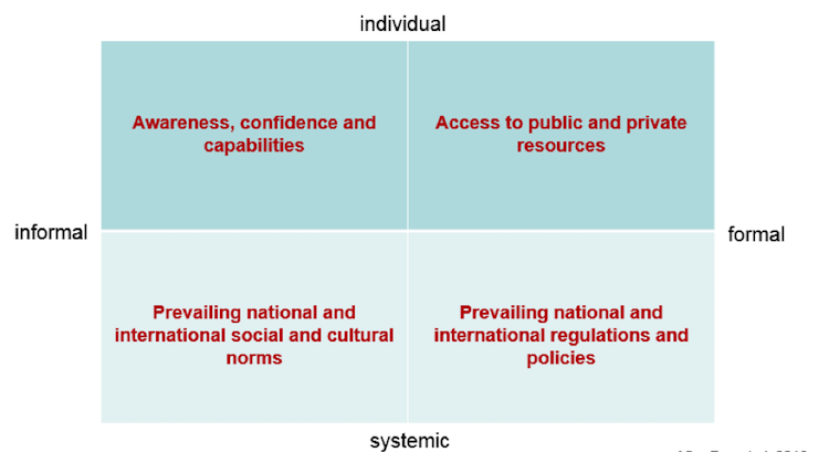 Figure 1 is a 2 x 2 matrix that uses these two axes (individual-systemic and formal-informal) to indicate different domains of change that need to be addressed together. It was developed for work on women’s rights and as noted by Green (2016):