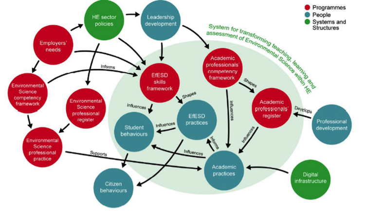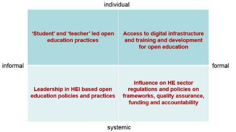 The choice of Education for Environment and Sustainable Development as the subject focus, academic practice through developing new OERs for both undergraduate and postgraduate courses as the people and practice focus, and leadership development as the people and policy focus, means that these activities fall more into the informal and individual and systemic quadrants (although the latter more at an institutional level than a sector level). These form the people elements of the diagram.