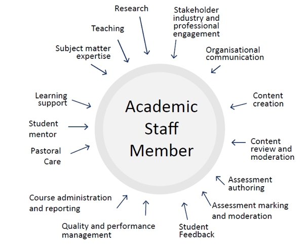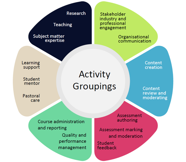 The activities that are seen in the graphical depiction of the academic staff member’s role (as above) can be logically grouped into areas of activity that align with the learning and teaching model and the learner’s journey. This following Figure 2 shows how that grouping has been conceptualised.