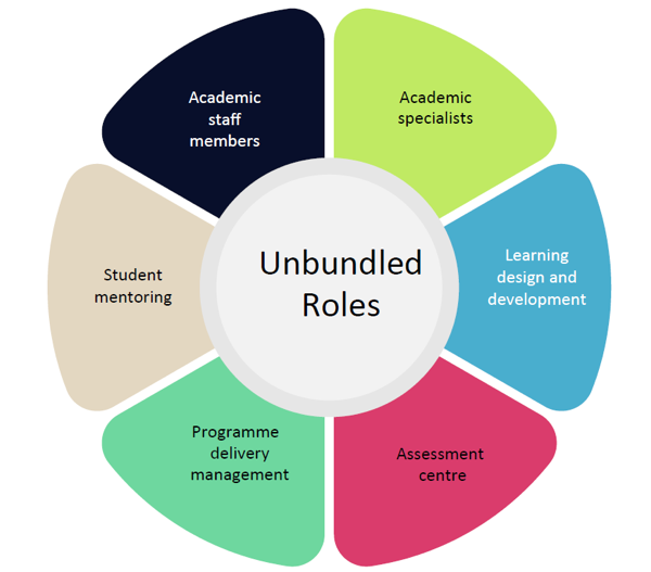 To an extent, the disaggregated components of the ODFL value chain have already informed unbundling of the role of the academic staff member prior to the adoption of the TCP. Two examples of this are: content creation, where learner resources have been designed, and written independently of Faculty; and assessment marking, where historically adjunct faculty have supplemented the job of marking learners’ assessment. However, the TCP has resulted in the adoption of a whole-of-organisation approach to a change in the structure of the organisation that more closely aligns organisational activity with the learning and teaching model.