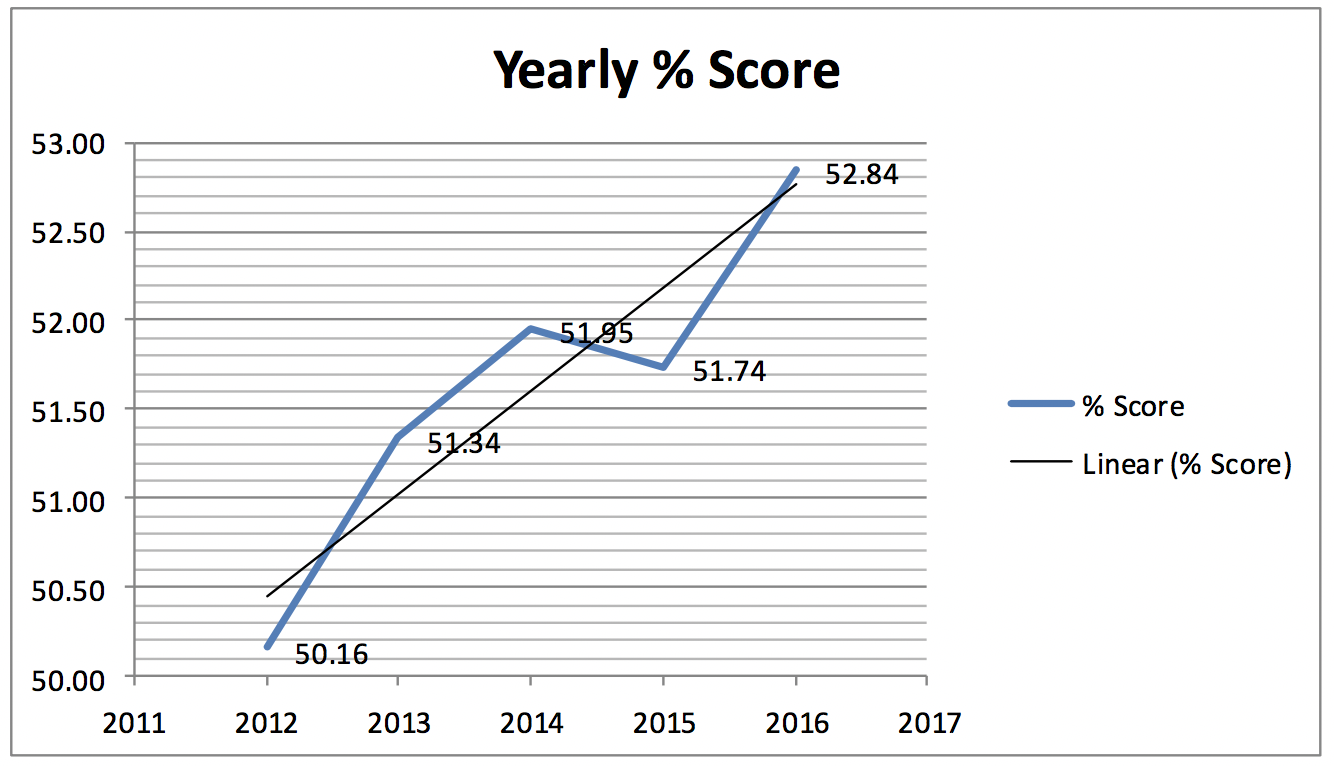 This study focused on a public primary school in Kenya with a population of 868 pupils and 20 teachers. The TESSA OER were introduced in the school in the year 2011 by teachers who were trained using TESSA activities in the in-service teacher training programme in Egerton University. Before the introduction of TESSA in the primary school, teachers mainly used strategies which made learner interactions with one another and the teacher minimal. The leaners sat in rows facing the chalk board with the teacher in front. This encouraged passivity, low motivation to learn and absenteeism among learners was common. However, the introduction of TESSA OER encouraged working in groups, which offered an opportunity for discussions and more use of local resources to support learning. The school performance in the Kenyan Certificate of Primary Examinations improved, as shown in Figure 1.