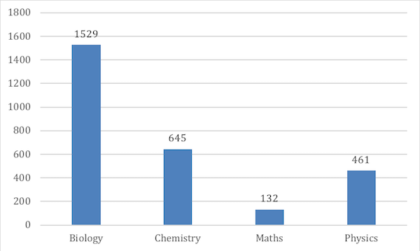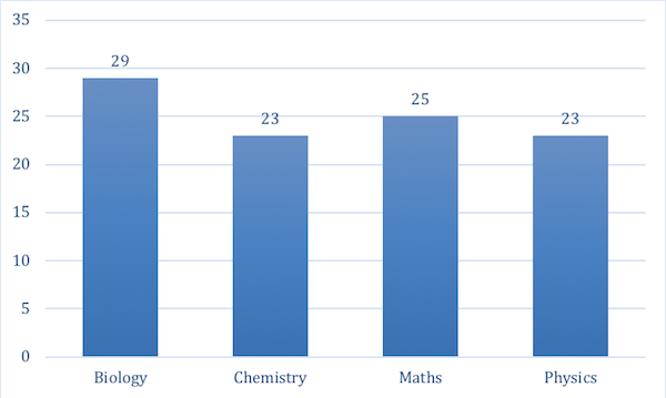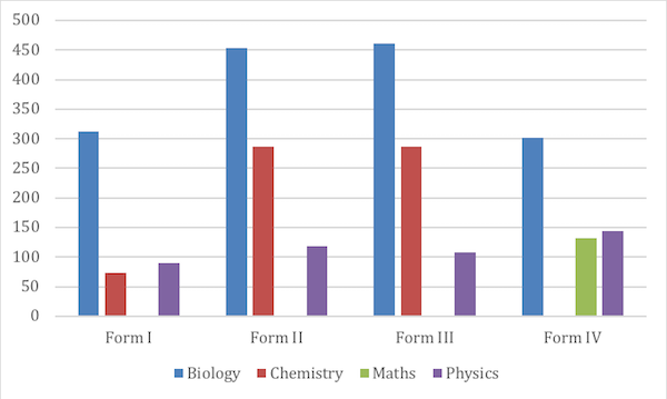 In Tanzania’s education system, students are allowed to drop chemistry and physics subjects at Form II if they are going into arts streams, while biology and mathematics are normally compulsory subjects. Therefore, those who accessed biology are likely the same students who accessed mathematics. On the other hand, the low percentage in chemistry and physics could be due to the fact that some students who dropped these subjects at Form II did not access them in subsequent classes, making a slightly small difference in access percentages.