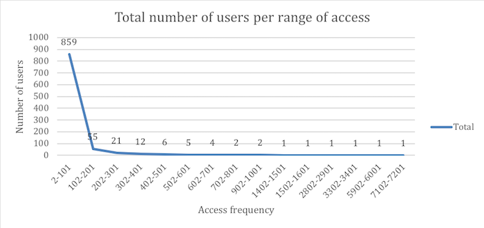 The activity patterns in terms of numbers of most and least active users were analysed. Users were categorised into different groups depending on the number of times they accessed the system while filtering records with duplicate users. Each group had an access range of 100, starting from 0-100, 100-200, and so on. The study shows that the majority of users accessed the system between 0-100 times followed by 102 to 201 times. Few users accessed the system 1400 times plus in the studied period. Figure 3 shows the number of users per range of access for the studied period