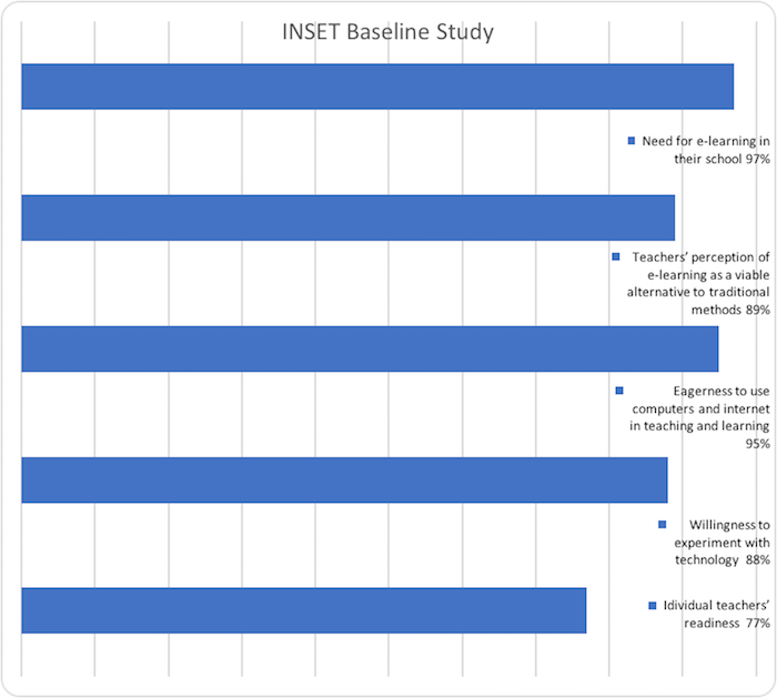 From the INSET baseline study conducted in 2017 (Junaid, 2018), it was evidenced that the prospects for success for a technology enabled training approach were quite high. The data for the INSET baseline was obtained from 130 Junior Secondary School Teachers in the participating project schools. Results indicated individual teachers’ readiness at 77%, willingness to experiment with technology at 88%, eagerness to use computers and Internet in teaching and learning at 95%, teachers’ perception of e-learning as a viable alternative to traditional methods (89%) and the strong need for e-learning in their schools at 97%.