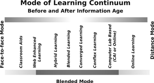 Before the “information age”, which the Merriam-Webster Dictionary defines as “a time in which information has become a commodity that is quickly and widely disseminated and easily available, especially through the use of technology”1, the world of education was marked by two main modes of delivery of education: face-to-face (or regular mode) and distance mode. They were the two opposite ends of a continuum of modes of education. The continuum is visualised in Figure 1. These two modes differ in features like the degree of resource intensiveness, size of learner groups and commitment of the learners in the context of time and place. In the present time, the continuum is populated by different modes of learning. Computer labs or laptop instruction, web-enhanced learning, blended learning, and fully online instruction have emerged as alternatives to face-to-face learning. In earlier systems, the focus was at the two ends of the spectrum (regular mode and distance mode), and there was almost a dissection. Whereas, in the present era, the focus has shifted towards the centre with various emerging options. The terms, Hybrid Learning, Conversed Learning, and Conflex Learning are styled names of the practices of blending face-to-face and online learning. With emerging technologies and innovations in digital learning, the complexity of their structure is expected to grow further, and even more new nomenclature may pop up.