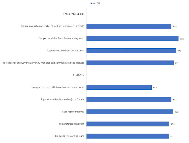 From the student perspective, support from class representatives was rated highly by students (sCns = 86%) followed by support from family member(s) or friends (sCns @ 84%), while access to a good Internet connection at home was rated low (sCns @ 65%). The overall sCns on support of entities was 79%. On the other hand, there was very strong consensus from faculty members on the helpfulness of various College entities with strength of consensus measures ranging from 92% for support available from the LMS team, to 83% for support from colleague(s) to manage their workload with overall mean sCns of 87% (Figure 4).