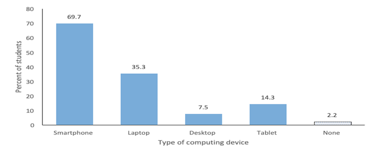 Among 865 students, more than two-thirds (603, 69.7%) owned a smartphone while tablets and desktop computers were less commonly owned, (< less than 15% of students). Nineteen out of 865 students (2.2%) did not own any type of computing device (Figure 5).