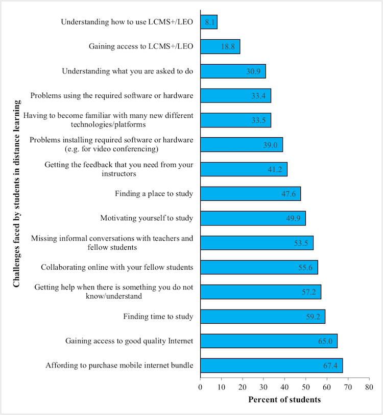 The challenges faced by students included the cost of purchasing mobile Internet bundles (67.4%), gaining access to good quality Internet (65%), finding time to study (59.2%), getting help when there is something one does not know/understand (57.2%), collaborating online with fellow students (55.6%), and missing informal conversations with teachers and fellow students (53.5%) (Figure 6).