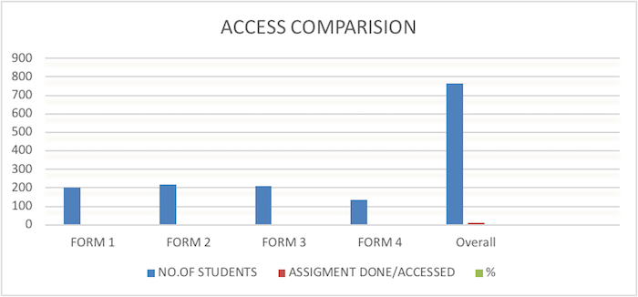 The table above, compared the percentage of assignments done against the whole school population. Clearly, the whole idea of access to the technologically-based education solution for this school was far below optimum. It brings to the fore that teaching high school youth from an average socio-economic class of society using mobile technology is quite a tall order. There may be more reasons for this but the key thing illustrated by these results is that access to technology, and the content attached to it, is a big challenge for the developing countries at this period of COVID 19. In fact, the shortcomings of this approach are depicted by the bar chart below.