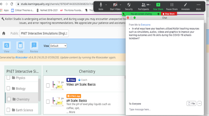 “In Biology, my technique is to give different learning tasks to different groups of students. At the end of each lesson, I ask students to form different groups of say 4-5 on Zoom in order to do a particular exercise on Kolibri. For example, I can ask them to watch a particular video on Kolibri say about how digestion takes place or about blood circulation in the body. Then, I ask them to note or write down in details via the chat room or the annotation board their own observations and then they screen share with the rest of the groups online.” |