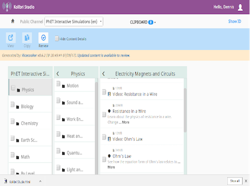 In their attempt to address the above problem, NCDC and UNICEF sought to leverage computer laboratories established in government-aided secondary schools since 2013 and ICT centers equipped with digital kiosks to install the Kolibri e-Learning platform where students and teachers can access Open Educational Resources contextualized for the needs in Uganda. The platform consists of two main software components. The Kolibri Content Curation System, which is a central cloud server that aggregates content from many sources, organized into multiple content channels. The Kolibri application is installed onto a local device, and imports channels of content. Users can interact with Kolibri offline, directly from that device or from a nearby client device that is connected to it. Once logged in onto the Kolibri application, users (depending on their role) can view at least one if not all of the following features: Learn, Coach, and Manage. A channel is a collection of content and metadata, organized into a “topic tree” structure (see Figure 1 above). The above content channels were automatically created and updated through Application Programming Interfaces (API) from external repositories such as PhET (University of Colorado, 2020). Kolibri also has the Youth Center channel which was manually curated through the Content Curation Server (see Figure 2 below).