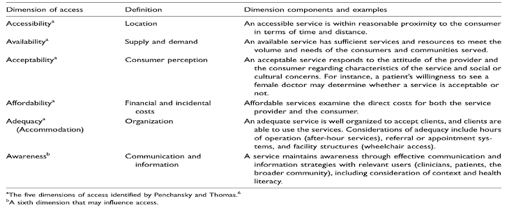 Saurman, E. (2016). Improving access: Modifying Penchansky and Thomas’s theory of access. Journal of Health Services Research and Policy, 21(1), 36-39. doi: 10.1177/1355819615600001.