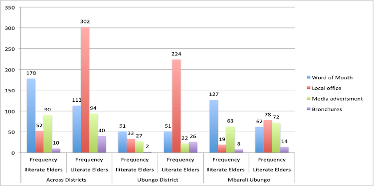 It is beneficial to identify the strongest medium for transmitting policy related information. Most often the medium tends to affect the level of policy awareness and understanding. From the findings across study districts, it was observed that word of mouth from peers is a major source of policy information among the illiterate elderly. While the literate elderly highly relied on local government offices to receive policy information. However, media, such as brochures, were also used as source of information, although, at minimal levels, as shown in Figure 2.