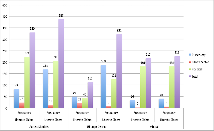 On the adequacy measure, the illiterate elderly’s choice of health facility was not compatible with their health needs as they were more likely to visit a health facility due to its proximity. Thus, the majority of the elderly visited dispensaries regardless of the seriousness of their illness. This implies that the majority of elderly people that visited dispensaries couldn’t receive treatment for non-communicable diseases, such as diabetes. Moreover, this finding signifies the elderly’s complaints about the shortage of medical supplies at lower-level health facilities. As DeWalt et al, (2004) observed, there is a significant relationship between reading abilities and individuals’ knowledge of health services. The study reported those with reading abilities to have more knowledge of health services outcome. This implies that with the advantage of informed decision they might have more chances of locating compatible health facilities.