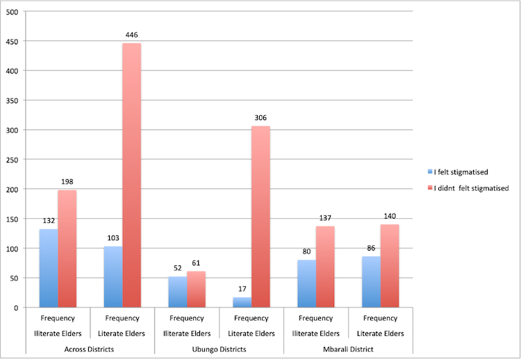 From the findings of the study across the districts, both literate (81%) and illiterate (60%) elderly noted that they did not experience stigma when dealing with health workers in public health facilities. However, in the Ubungo district, 46% of the illiterate elderly expressed their experience of being stigmatised by health workers at public health facilities, against 5% of the literate elderly. There was a similar trend in the Mbarali district, with 37% of the illiterate elderly experiencing stigma, compared to 38% of the literate elderly, as shown in Figure 4.
