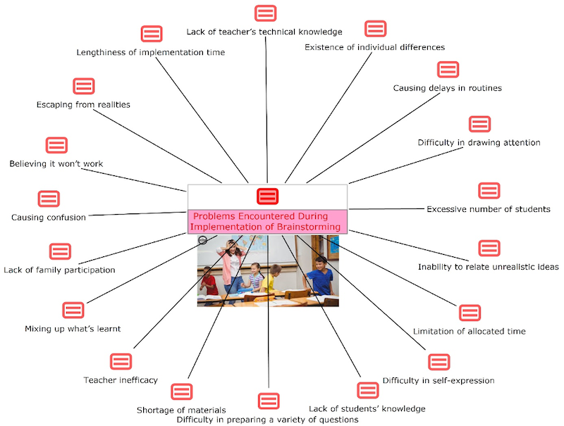 The third theme of the present study revealed the problems which are faced while implementing the brainstorming technique in an activity. These problems may stand as barriers to effective brainstorming in the teaching-learning process. One point that is coded within the model demonstrating the problems theme is the existence of students who think that the brainstorming sessions will not work, and they cannot come up with original solutions to their learning tasks. This may result from fear of critical evaluation by other members of the brainstorming group (Putman & Paulus, 2009), among some other reasons, and thus could culminate in some individuals’ giving up on the group and a decline in the productivity of idea generation (Isaksen & Gaulin, 2005; Napier & Gershenfeld, 2004). Another significant code that stands out as a problem militating against the functionality and productivity of a brainstorming group is teacher inefficacy. In the educational context, teachers play a critical role as designers and facilitators of brainstorming sessions. As brainstorming is a group activity, teachers can address the needs of groups, manage group interaction, collectively find out solutions to complicated problems and provide joint support for fulfilment of the generated ideas (Isaksen & Gaulin, 2005). Teacher inefficacy may generally make its presence felt as difficulty in drawing students’ attention as it is purported by the participants of the relevant studies. The way a teacher poses a brainstorming prompt becomes more of an issue, since it is claimed to affect performance (Goldenberg & Wiley, 2019).