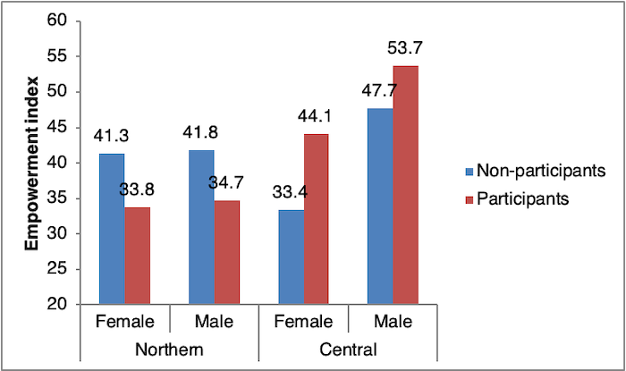 The empowerment indices of the respondents in the two study regions are further illustrated in Figure 2 below.
