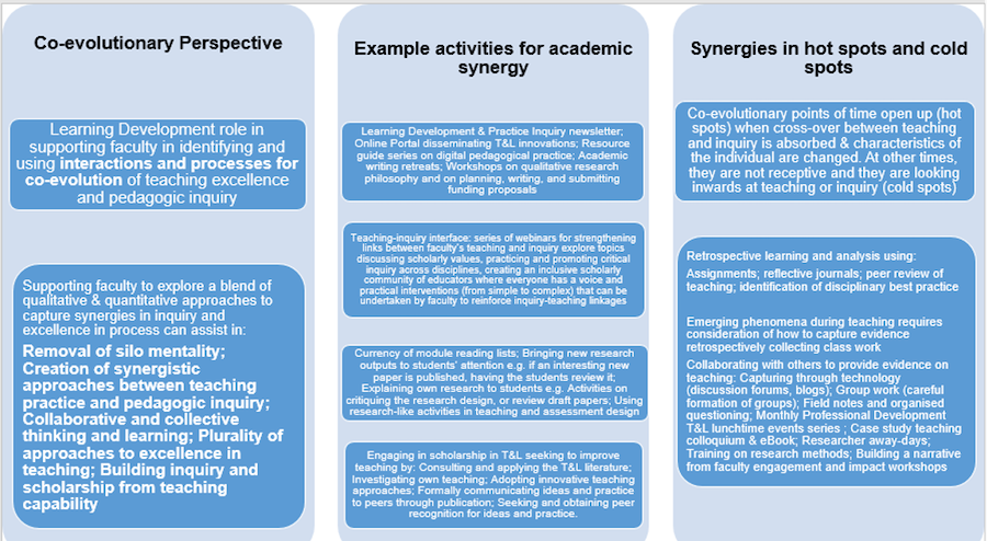 A new initiative introduced to the role of learning development is discussed, which involves supporting faculty to seek evidence-based approaches to achieve excellence in their teaching practice. A key question is how to gather the right types of evidence to demonstrate teaching excellence. A co-evolutionary strategy for exploring the evidence base for teaching excellence within the context of a new Technological University in Ireland is discussed. Studies on synergies focus on the process rather than the outputs. The theoretical approach underpinning this work is based on theories of ‘co-evolution’ (Volberda & Lewin, 2003; Volberda, 2005), and a model is proposed that can recognise and capture the interactions and complex underlying processes in exploring teaching excellence and the integration of conscious continuous inquiry of practice, processes, and activities in teaching and learning.