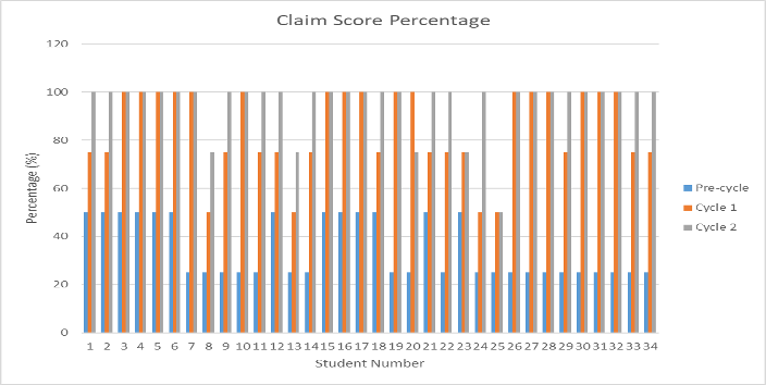 Figure 1 indicates the percentage of students' scores in the claim component from the pre-cycle to cycle 2. The highest claim component score increased from pre-cycle action to cycle 1 action by 75%. The increase in the percentage of claim scores indicated in Figure 1 also occurs in cycles 1 to 2. Most students obtained the highest increase of 50% from cycle 1 to cycle 2.