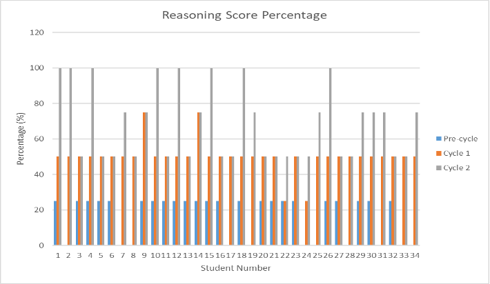 Figure 3 indicates the percentage gain of the reasoning component score of each cycle from the pre-cycle to the 2nd cycle stage. The highest increase in reasoning scores (50%) increases in the pre-cycle to cycle 1. Some students did not experience an increase in the pre-cycle stage to cycle stage 1, namely, student number 22, with a score percentage of 25%.