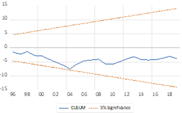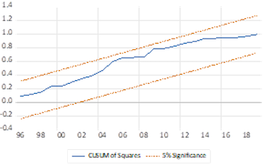 As can be seen in Figures 1 and 2, CUSUM and CUSUMSQ of the recursive residuals stay within lines that symbolise the critical bounds at the .05 level of significance. Therefore, both tests indicate that the estimated model is stable and predictable over the sample period.