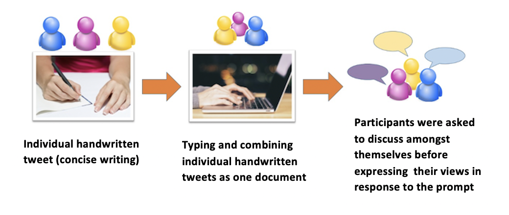 Along with verbal discussions between the participants and the focus group discussion moderator (the researcher), part of the focus group required the participants to engage in a hands-on activity, which aimed at encouraging individual as well as collaborative discussions. The participants had to write down their reflections in the form of a tweet in response of the following prompt:
