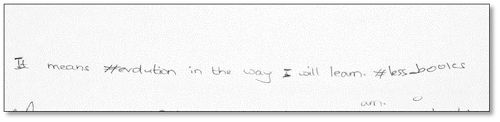 Therefore, as suggested by Ramlo (2011), hyphenating phrases so as to remain closer to the context and to enhance the process of interpretation/meaning making was considered. For instance, from the raw text of one of the tweets, a sentence which was formulated as: It means #evolution in the way I will learn. #less_books, the word cloud as shown in Figure 6 displaysthe term books and less as two distinct terms. By putting a hyphen between the word less and books in the raw texts and generating another version of the word cloud (see Figure 7), it was possible to retain the meaning. Likewise, this approach was used for those sentences which lost their meanings in the first version of the word cloud.