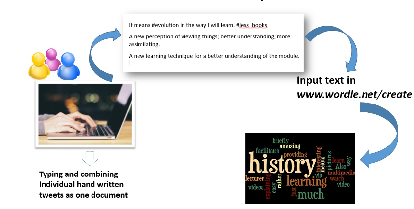 Firstly, each team combined tweets which participants had initially typed using the laptop and fed them into the Wordle application (www.wordle.net/) as shown in Figure 3. This step helped generate word clouds for each team. Figure 4 displays an example of the word cloud created using the combined tweets written by participants from the BA (Hons) Joint Humanities programme.