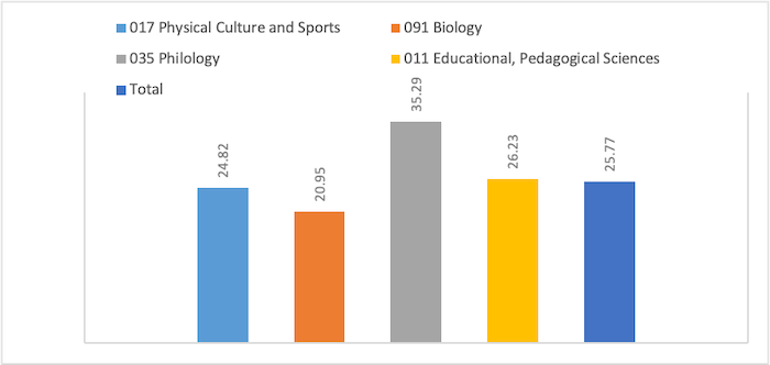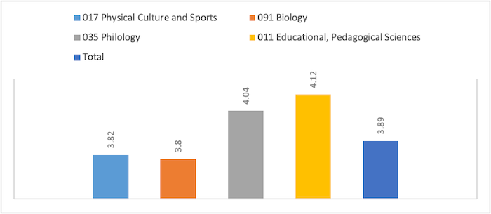 The respondents of the study were postgraduate students majoring in 011 Educational, Pedagogical Sciences, 017 Physical Culture and Sports, 035 Philology, 091 Biology, who studied in the first year of the third level of higher education. In the structure of respondents, the first place was taken by students majoring in 011 Educational, Pedagogical Sciences (34.99%), the second — postgraduate students majoring in 035 Philology (33.33%), which was two-thirds of all respondents. Postgraduate students majoring in 017 Physical Culture and Sports and 051 Biology took the following places in the structure of respondents: 20.9% and 11.58%, respectively.