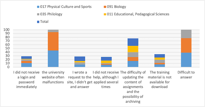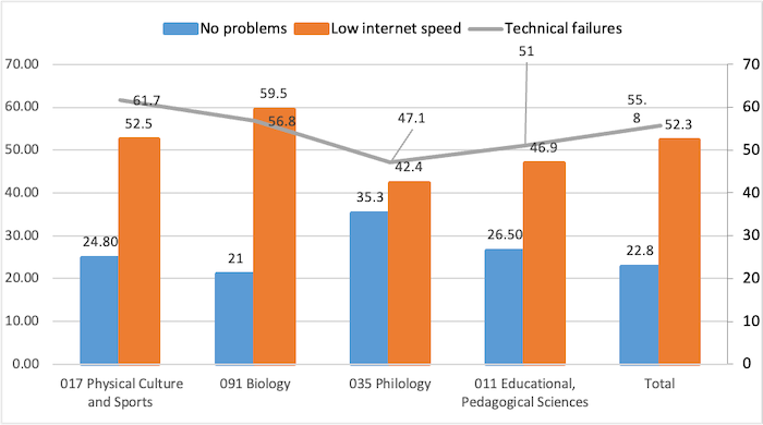 Moreover, 35.39% of postgraduate students majoring in 035 Philology indicated the lack of technical problems in the process of implementing distance education technologies. At the same time, only 20.95% of postgraduate students majoring in 091 Biology indicated the lack of technical problems in the process of implementing distance education technologies (Figure 3).