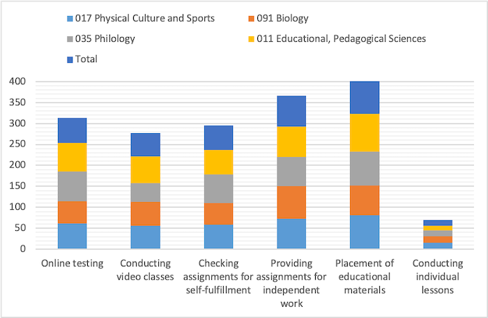 Postgraduate students majoring in 017 Physical Culture and Sports and 091 Biology rated the work of their teachers lower (3.82 ± 0.10 and 3.80 ± 0.08 points, respectively) than those majoring in 011 Educational Pedagogical Sciences and 035 Philology (4.04 ± 0.11 and 4.12 ± 0.13 points, respectively) (p < 0.05). We explain this by the fact that the majors 017 Physical Culture and Sports and 091 Biology are more practically oriented. Obtaining a degree in 091 Biology requires special material and technical resources for teaching and conducting experimental research, which greatly complicates the teacher’s work and the possibility of effective virtual teaching. The educational programme in 017 Physical Culture and Sports is focused on conducting research in the following areas: sports; physical education, health-improving physical activity of various groups of the population, and requiring experimental work in the appropriate sports facilities, which were closed during the pandemic.