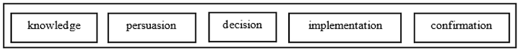 The innovation-decision process consists of five steps (Çakıroğlu, 2016; Sahin, 2006). (1) Knowledge: This is the step in which the innovation is perceived, and the individual is aware of the innovation. (2) Persuasion: This is the step in which the individual's attitude toward the innovation decreases and uncertainty about the results of the innovation decreases. (3) Decision: This is the step in which the individual's behaviour is observed to accept or reject the innovation. (4) Implementation: This is the step where the individual begins to use the innovation. Although the previous steps are mostly mental processes, this step shows that the individual uses the innovation itself. (5) Confirmation: In this step, the individual uses the innovation for a short period of time and then continues to use it or discards it permanently. The innovation-decision process is illustrated in Figure 1.