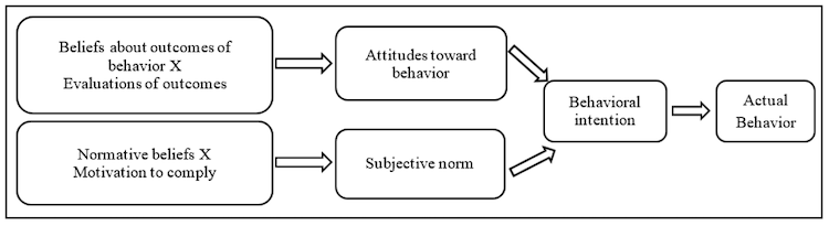 According to this theory, intention is important in the emergence of an individual's behaviour. Attitudes and subjective norms influence the intention. Attitudes consist of beliefs and outcomes for the appropriate behaviour. Subjective norms are expressed as beliefs about motivation and rules (Fishbein & Ajzen, 1975). This theory is also important at the stage of adopting innovation and making it a behaviour. The reasoned action theory is expressed in Figure 2 (Çakıroğlu, 2016; Davis, Bagozzi & Warshaw, 1989).