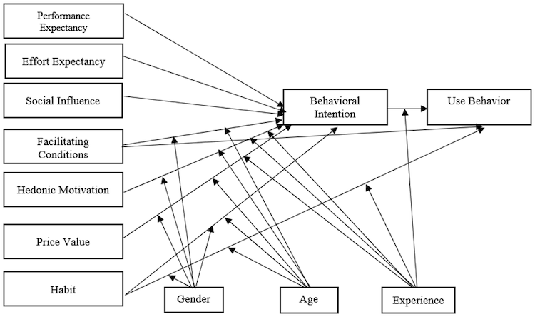 Venkatesh, V., Thong, J. Y. L., & Xu, X. (2012). Consumer acceptance and use of information technology: Extending the unified theory of acceptance and use of technology. MIS Quarterly, 36(1), 157-178. doi:10.2307/41410412.
