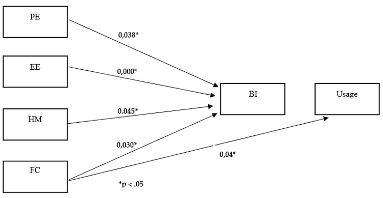 The study's hypotheses and the model's visual version are shown in Figure 7. According to the model created, the variables PE, EE, SI, FC, HM, and HT positively influence the variable BI. The variables FC, HT, and BI positively influence the usage status.