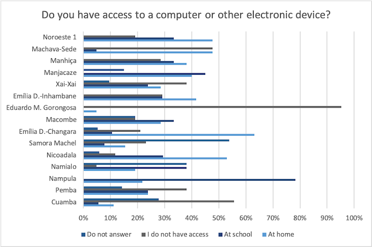 However, Machava-Sede and Noroeste 1 Secondary Schools had the highest percentage of students, both with 48%, with access to a computer or other electronic device at home, while at Eduardo Mondlane Secondary School in Gorongosa, no student had access to a device at home.