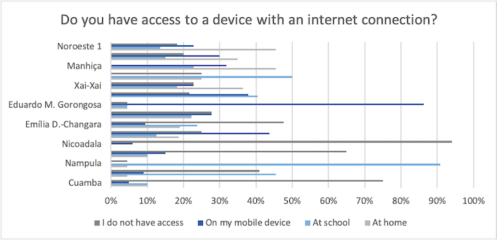 Results (Figure 4) revealed that 69% of students had access to a device with an internet connection, and 31% did not have access to the internet. The school with the highest proportion of students with internet access (13%) was Emília Daússe Secondary School in Inhambane.