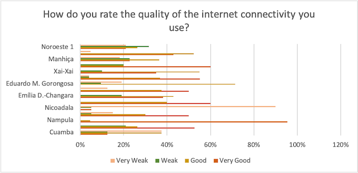 Results revealed that 41% of the students considered the quality of the internet to be very good, 35% good, 10% poor, and 14% very poor. The school with the highest proportion of students who considered internet connectivity as very good was Nampula Secondary School, (91%), and the school with the highest proportion of students who considered internet connectivity as very poor was Cuamba Secondary School, (38%) (Figure 5).