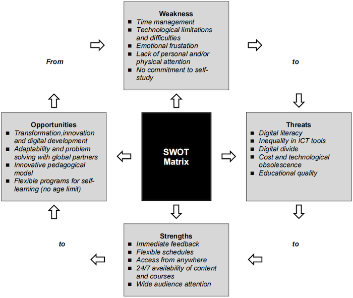 Cojocariu, V. M., Lazar, I., Nedeff, V., & Lazar, G. (2014). SWOT analysis of e-learning educational services from the perspective of their beneficiaries. Procedia-Social and Behavioral Sciences, 116, 1999-2003.