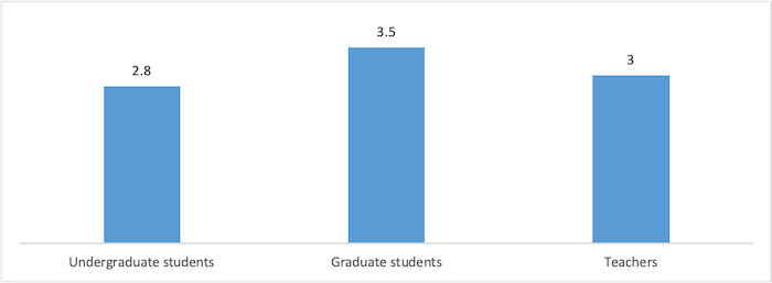 Respondents had to rate the distance learning process on a 5-point Likert scale where 5 meant very good and 1 very bad (Fig. 1). Overall, students rated the distance learning process positively, with an average score of 3.2 points. As for the distribution of point averages by levels, it was found that graduate students evaluated the process even more positively than undergraduate students. Undergraduate students rated the distance learning process with an average score of 2.8 points, while the average for graduate students was 3.5. The teachers who participated in the study positively evaluated the distance learning process. Their average point for distance learning was 3 points. The results show that there was no negative effect from switching from face-to-face to online learning. This was due to the fact that this is the generation of the digital age, who are familiar with online learning and have good digital skills.