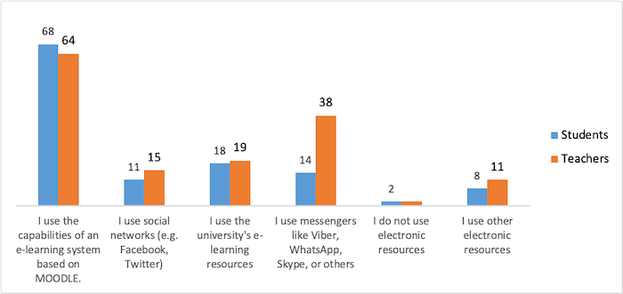 The majority of students (n = 285, 68.3%) mainly used Moodle's platform for online learning mode (Fig. 3). This rate is the same for both undergraduates and graduate students, as well as for students from different universities. Students also used the WhatsApp, and Skype platforms for online learning (14% of respondents). Most of the teachers (n = 30, 64%) mainly used the Moodle platform for the online teaching mode. However, they also used the WhatsApp, and Skype platforms (n = 18, 38%) and university e-learning resources (n = 9, 19%).