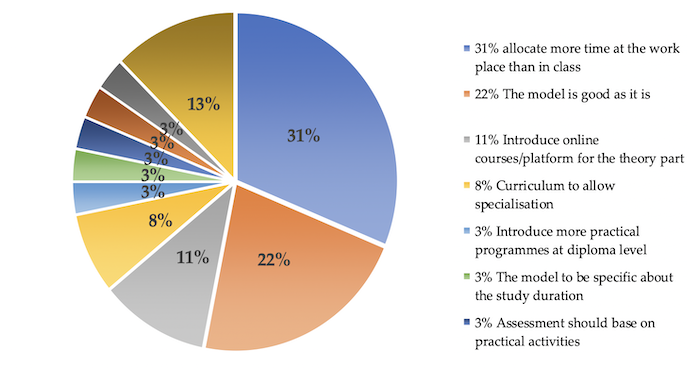 A significant number of respondents (prospective students) proposed more time be dedicated to actual work than classroom theory. Supported by the literature, this model recommends for learning time between classes and work to be established for specific programmes and be clearly stated in the respective curricula. For example, Sweet (2018) reported that, in Algeria, trainees spend an initial short period in full-time training, followed by alternate times spent between work and training while, in Egypt, trainees spend two years in full-time training followed by a year of alternating between the workplace and the classroom.