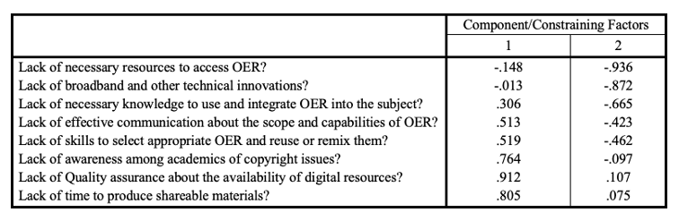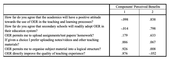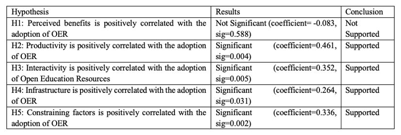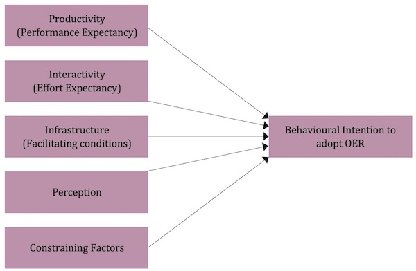 Padhi (2018) examined the factors that could influence teachers’ behaviour in adopting OER in India. The author focused on the UTAUT model, with data collected through surveys from 22 Indian universities. From this study it could be noted that the constructs ‘Performance Expectancy’ and ‘Effort Expectancy’ were positively significant and the constructs ‘Social Influence’ and ‘Facilitating Conditions’ were both insignificant. Thus, the result indicated that the variables ‘Performance Expectancy’ and ‘Effort Expectancy’ positively influenced teachers’ behaviour in adopting OER in their teaching process.