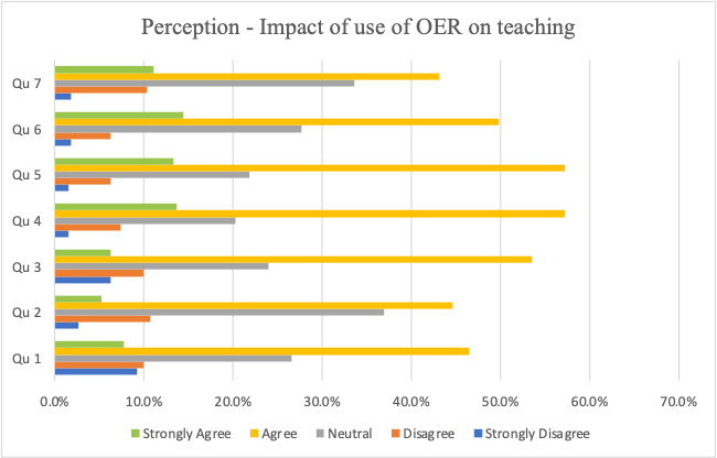 From the ‘Perception’ cluster, which is about the educators’ perception towards the behavioural intention to adopt OER, it can be observed that more than 50% of the educators’ population agreed they have a positive attitude towards integrating OER into teaching.