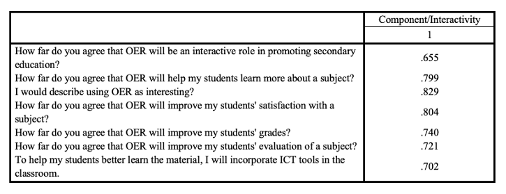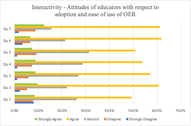 From the ‘Interactivity’ cluster, which looks at the attitudes of educators with respect to ease of use of OER in teaching, it can be observed that more than 50% of the educators’ population agreed that OERs could help to promote secondary education and improve students’ grades. This is because when the students get opportunities for interaction and engagement with the learning materials, such as through the use of multimedia elements and collaborative activities, they are more likely to benefit from them, which can lead to improved academic performance.