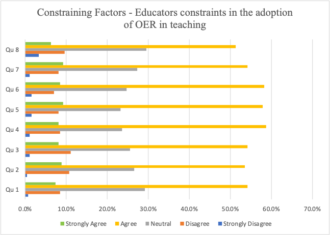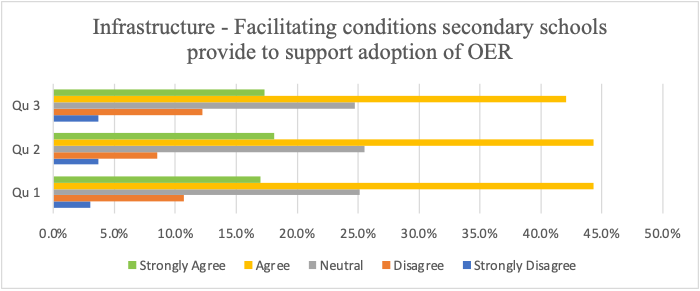From the ‘Infrastructure’ cluster, which gives an indication of the facilitating conditions schools have to support the adoption of OER, it was observed, from the educators’ perspective, that the majority of them agreed that schools lack the ICT infrastructure to adopt OER. The schools do have adequate support in terms of technology and pedagogy but not in terms of infrastructure, which encompasses issues with broadband, hardware and software, respectively.